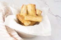 Salah satu cara memasak singkong yang paling sederhana dan ringan adalah dengan menggunakan oven. Untuk melakukan ini, kita hanya perlu mengupasnya, memotongnya menjadi batang-batang dan memasaknya terlebih dahulu agar bagian dalamnya empuk. Selanjutnya kita panggang selama setengah jam sampai berwarna keemasan. Hasilnya adalah singkong yang empuk di dalam dan renyah di luar, cocok disajikan sebagai hidangan pembuka dengan saus atau sebagai hiasan.