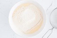 Ayak 200 g tepung terigu dengan 10 g baking powder dan 1 sejumput garam, lalu tambahkan bahan-bahan ini ke dalam adonan, kocok dengan kecepatan rendah hingga tepung tercampur.
