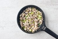 Kami menambahkan 400 g paha yang dipotong sangat kecil dan dibumbui dengan garam, lalu masak semuanya selama sekitar 5 menit, aduk hingga ayam benar-benar berwarna kecokelatan, tetapi tanpa membuatnya kering.