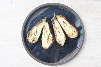 Kami mengeluarkan terong dari oven, memotongnya menjadi dua memanjang, mendapatkan 4 bagian dan membuat beberapa potongan pada daging buahnya agar isiannya tersebar dengan baik di dalam dan terong tetap mempertahankan bentuknya. Jika mau, kita bisa melubangi sedikit daging buahnya agar isiannya lebih mudah ditampung.