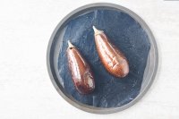 1. Kami memanggang terong utuh yang diberi minyak pada suhu 200 ºC selama 30 menit