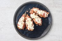 Oleskan isian ayam di atas terong, tutupi dengan 50 g keju parmesan parut dan panggang selama 10 menit hingga keju benar-benar meleleh.